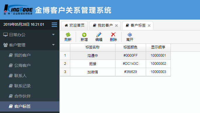 根據(jù)不同客戶的不同聯(lián)系狀態(tài)進(jìn)行標(biāo)簽設(shè)定,可新增標(biāo)簽。我們可以在后臺的【客戶管理】找到【客戶標(biāo)簽】,然后點(diǎn)擊【新增】,進(jìn)入我們的新增界面即可進(jìn)行標(biāo)簽的新增。